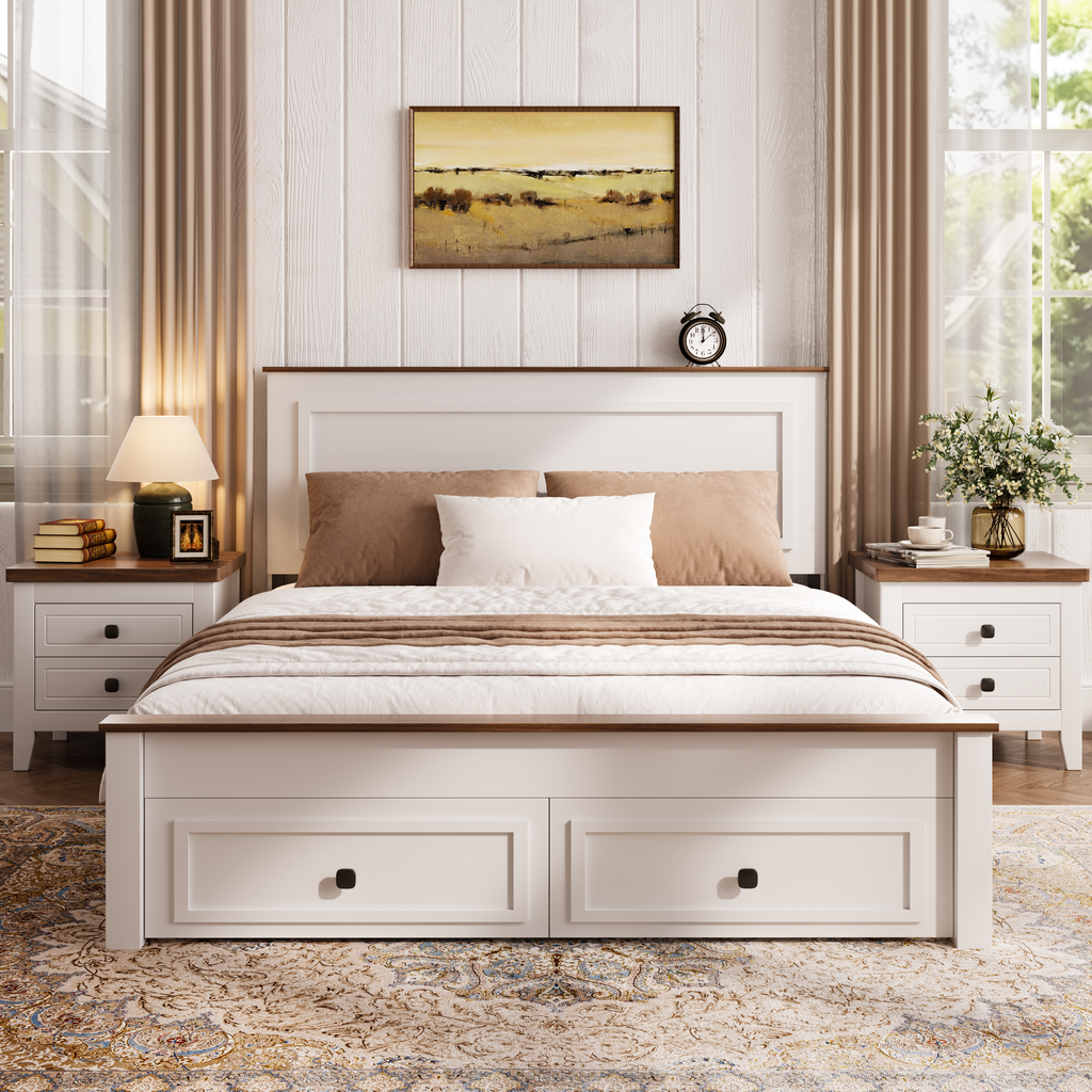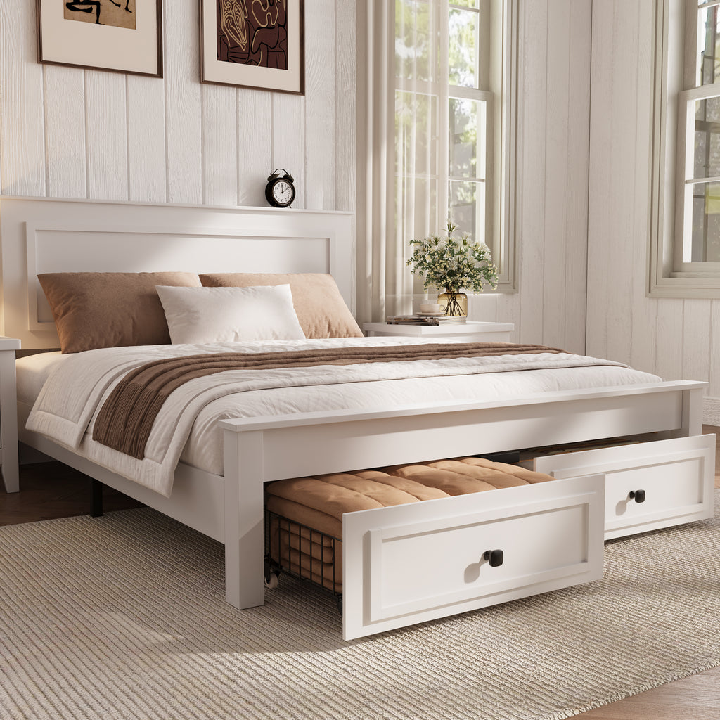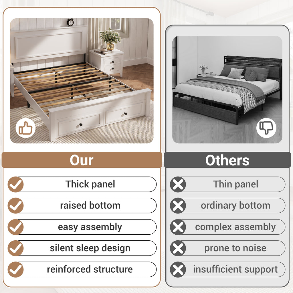 [Storage Bed Frame with Two Drawers] - Full size bed frame with storage includes two spacious rolling drawers that provide convenient under bed storage for bedding clothing blankets and seasonal items. Bed frame with drawers helps maximize bedroom space while keeping bedrooms organized and clutter free.