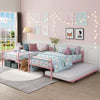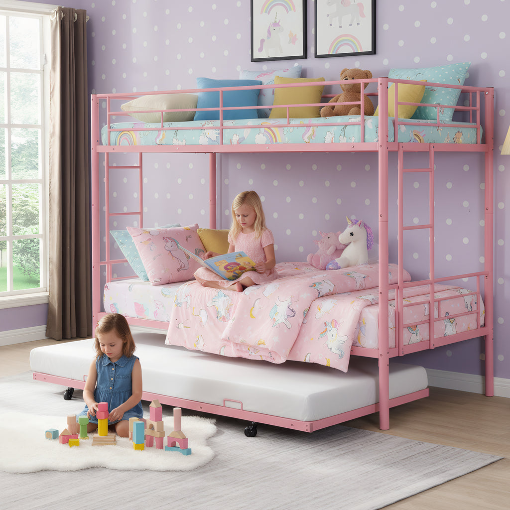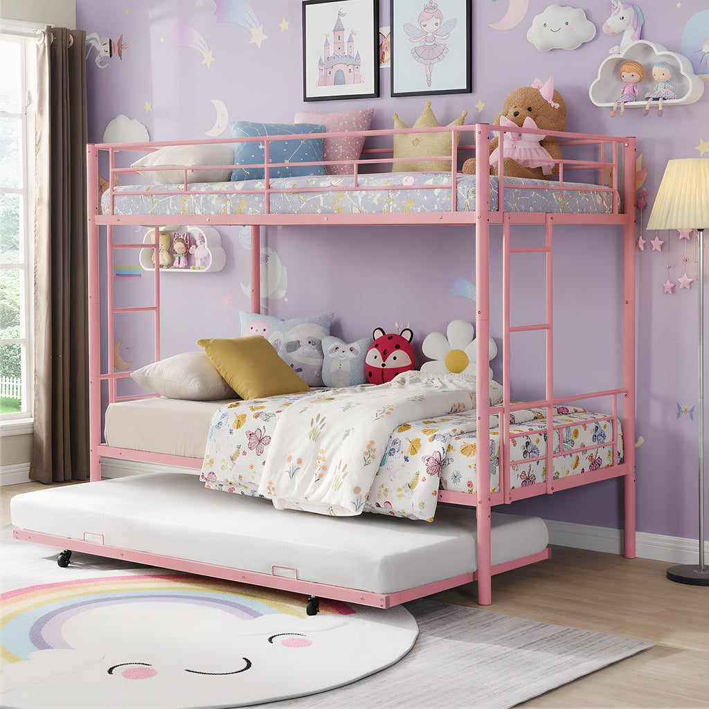 Twin Over Twin Metal Bunk Beds with Trundle Bed, UHOMEPRO Heavy Duty Bunkbed with Safety Guard Rails, 2 Ladders, Durable Bunk Beds Twin Over Twin Size for Kids Teens, Dorm Room Bedroom, Pink