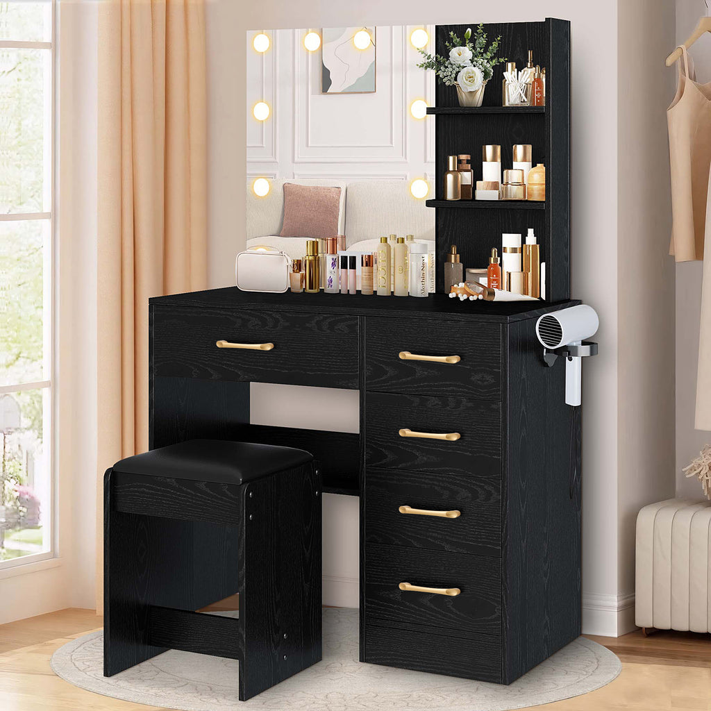 The 5 spacious drawers, open shelves, and large desktop offer ample room to store all your beauty products, hair tools, and accessories. The drawers glide smoothly and the cabinet is spacious enough to hold larger items, ensuring everything has a dedicated home and stays organized. The included vanity stool is designed for comfort and style, featuring a padded seat and sturdy base that provides stability and support. Its sleek design complements the vanity set perfectly, creating a cohesive and polished look in your bedroom or makeup area.