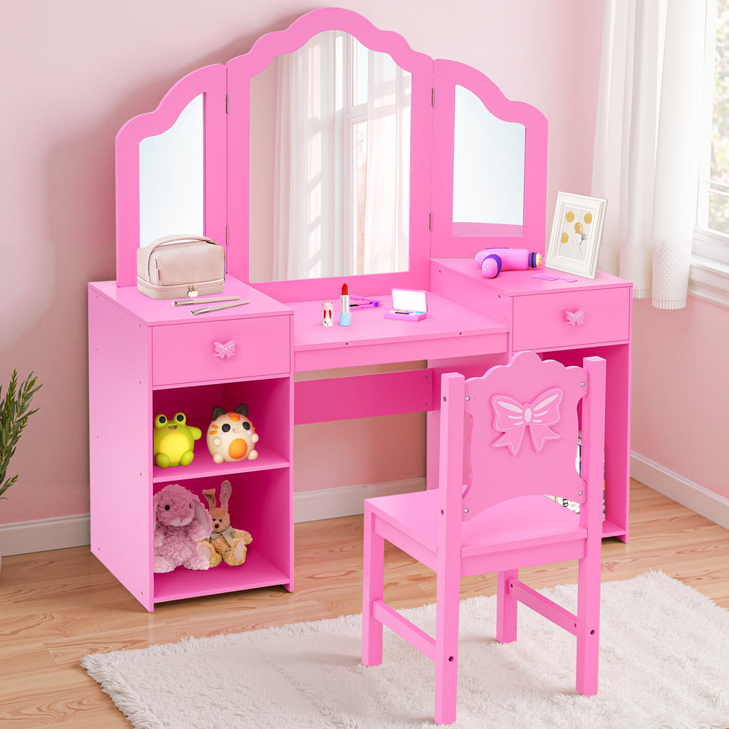 Unlock magical pretend play with UHOMEPRO's Princess Vanity Table & Chair Set! Designed for little girls 3-8 years old, this pink princess makeup vanity creates a fairy-tale space featuring butterfly motifs, a scalloped-edge mirror, and dreamy finishes. The sturdy wooden dressing table delivers 2-in-1 functionality as a vanity desk with drawers and an activity station. An oversized tri-fold mirror (shatter-safe acrylic!) offers 270° visibility while foldable panels save space. Effortless organization includes a storage cabinet, two open cubbies, and deep drawers – perfect for toy cosmetics and crafts on the 42.5-inch vanity top.Safety-engineered for peace of mind: Anti-tip base, non-slip feet, and CPC-certified non-toxic finishes on durable MDF wood (0.78"+ thick panels). The matching chair features a wide reinforced base with structural bows for maximum stability. Beyond a toy vanity, it transforms into a tea party spot or craft center. Simple assembly with instructions included. Give the gift of creativity and organization – this charming vanity with mirror and storage inspires imaginative play while teaching tidiness skills, perfect for birthdays or holidays!