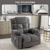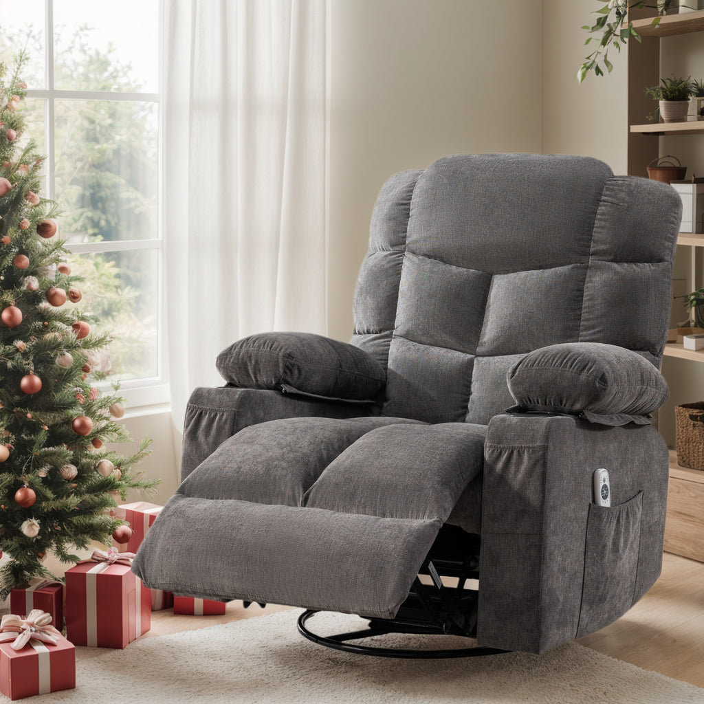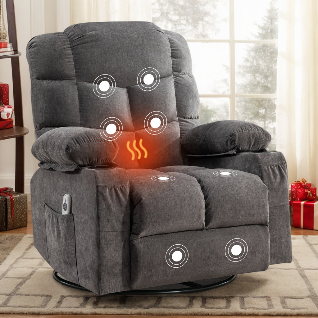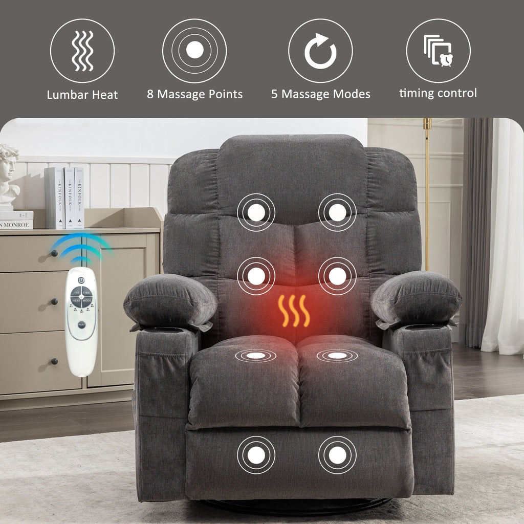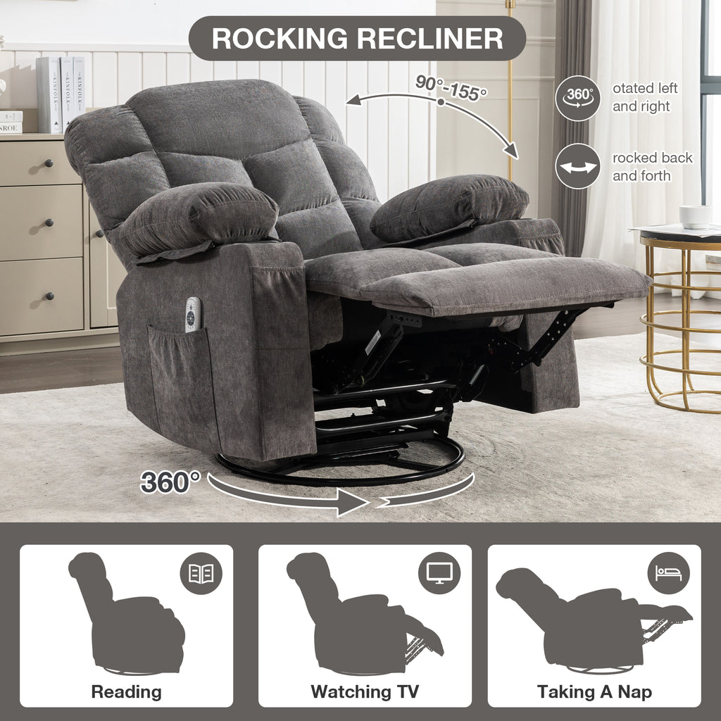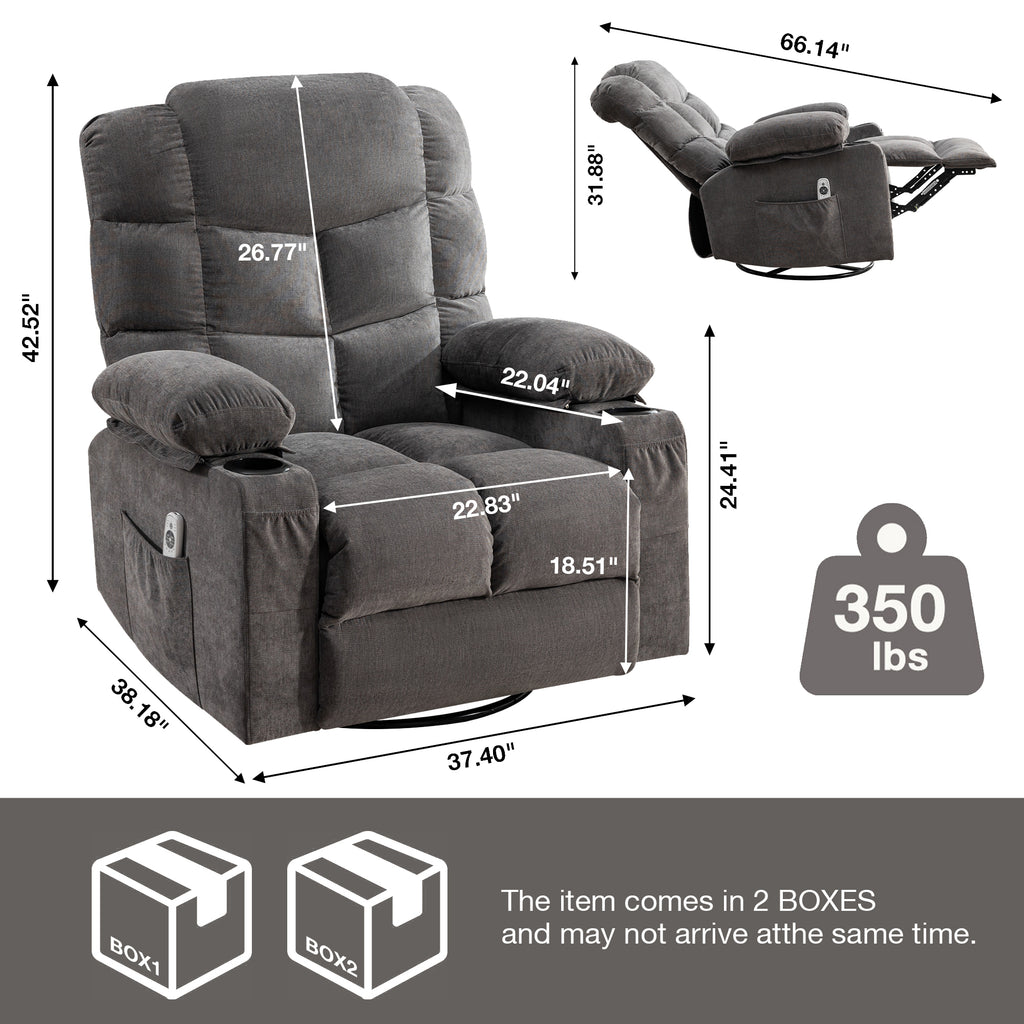 Vibration Massage & Heating - This Swivel Rocker recliner chair has 8 massage points and 2 different massage intensities that can meet your different massage needs. The four areas of the massage are distributed in the calves, thighs, waist, and shoulders. You can freely choose the intensity and position of the massage. Waist heating with a massage function point which makes Allows you to promote blood circulation while massaging.