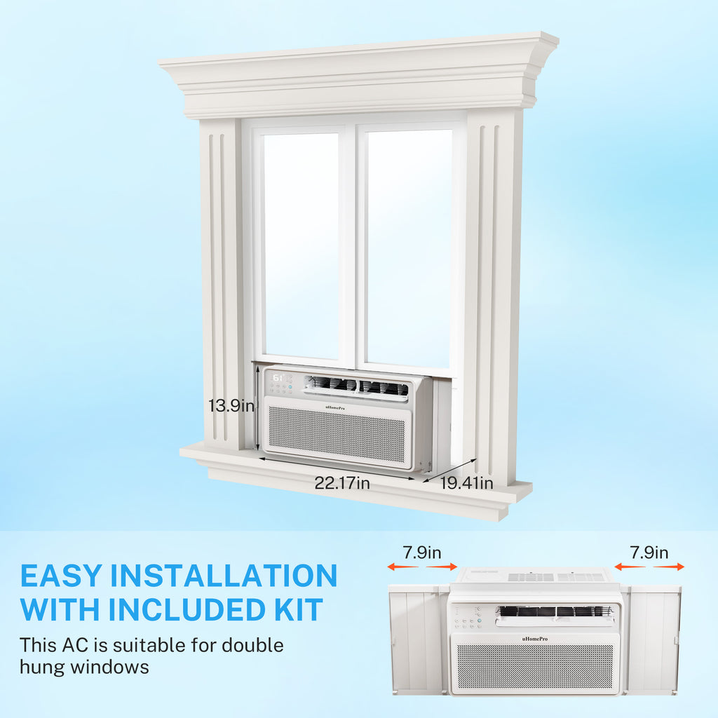 Upgrade your space with this UHOMEPRO window air conditioner, a low-profile air conditioner designed for bedrooms, apartments, or small rooms. This quiet window air conditioner seamlessly switches between Cool, Dry, Fan, and Auto modes: Cool lowers temps while reducing humidity; Dry combats sticky air with automated cycles; Fan offers a gentle breeze; and Auto adjusts modes based on room conditions using seven smart sensors. Optimize nighttime comfort with SLEEP mode—it gradually raises temps every 30-60 minutes (up to 6 cycles) and dims lights for undisturbed rest. ECO mode saves energy by cycling the compressor on/off once your desired temp is reached, while the fan maintains airflow. Control settings remotely via the Smart Wi-Fi Control or included remote—adjust modes, fan speeds, timers, or toggle the LED display for a serene ambiance. As a small window AC unit, its compact, air conditioner portable design fits most windows and includes easy-slide filters with a 500-hour reminder for cleaning—simply vacuum or wash monthly to prevent airflow issues. Ideal as an apartment air conditioner or air conditioner for bedroom, it balances power and efficiency (under 43 dB) with smart features like frost-prevention sensors and intermittent fan delays for energy savings. Perfect for renters or small spaces, this ac window unit delivers year-round comfort without sacrificing style or space.