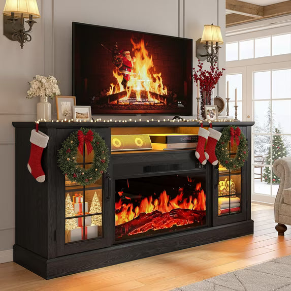 • Wide 63" TV Stand with Strong Support: Crafted from durable wood, this console holds TVs up to 70". Its dual-purpose design functions as both a TV cabinet and fireplace centerpiece.