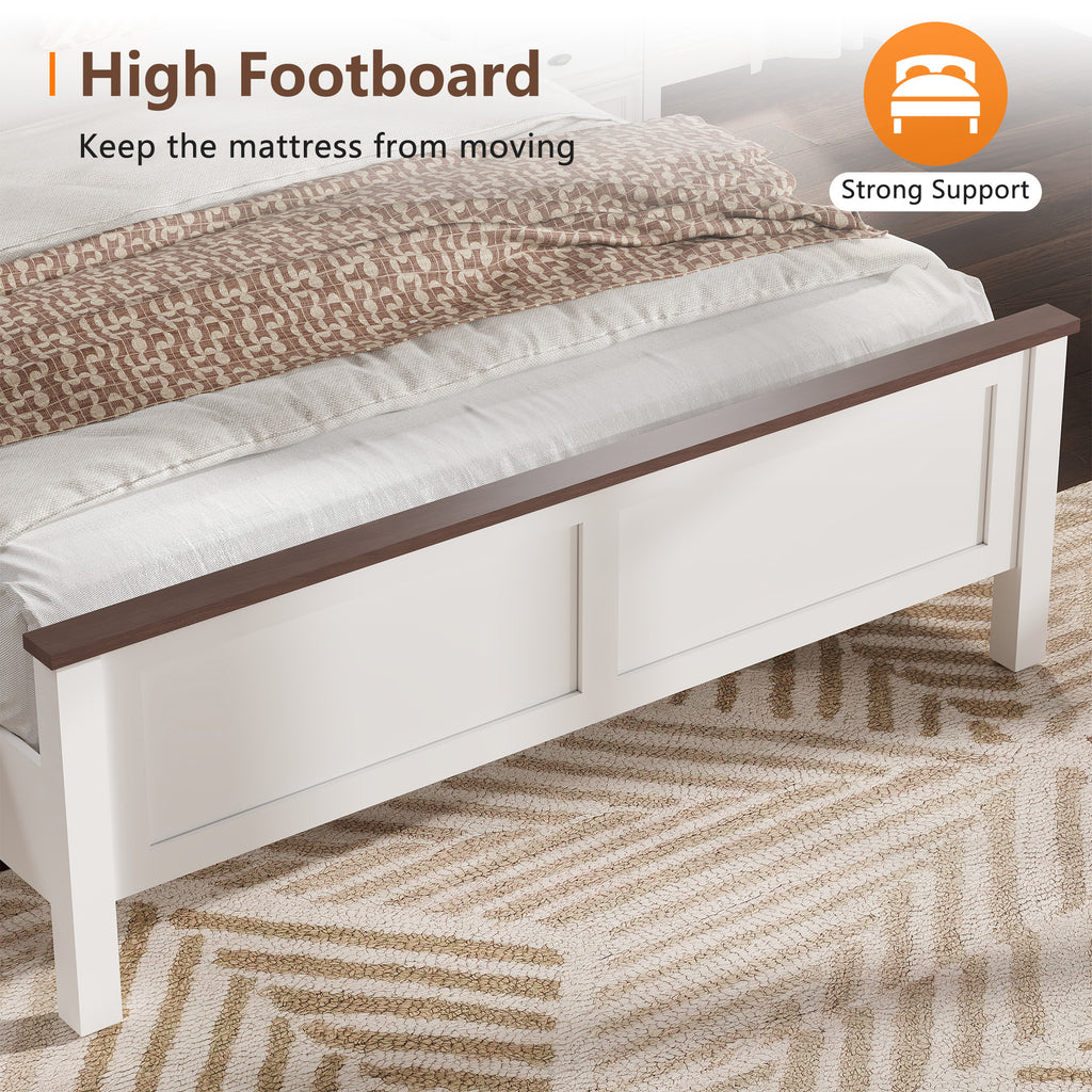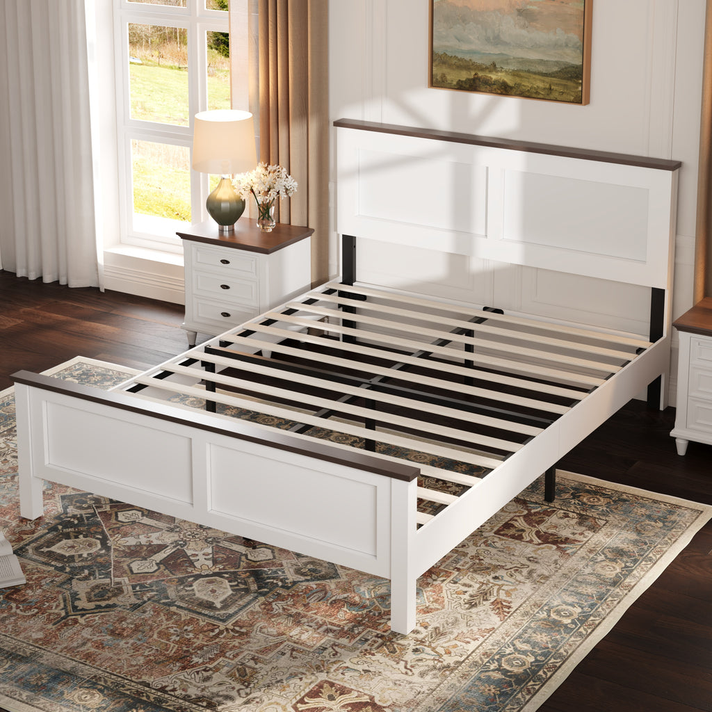 Elevate your bedroom with this farmhouse-chic bed frame, blending rustic charm and modern durability. Crafted from sturdy wood with reinforced iron legs and support beams, it ensures enhanced weight capacity. The crisp white finish is accented by rich brown woodgrain panels on the headboard and footboard, offering timeless elegance. Versatile enough to complement both vintage and contemporary décor, its balanced design adds a statement piece to any space.